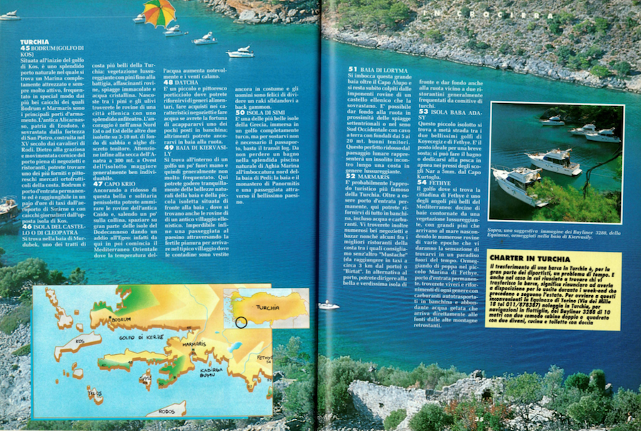Il golfo dove si trova la cittadina di Fethye è uno degli angoli più belli del Mediterraneo: decine di baie contornate da una vegetazione lussureggiante, con grandi pini che arrivano al mare nascondendo le numerose rovine di varie epoche che vi daranno la sensazione di trovarvi in un paradiso fuori del tempo. Ormeggiando di poppa nel piccolo Marina di Fethye, porto d’entrata permanente, troverete viveri e rifornimenti di ogni genere con carburanti autotrasportati in banchina e abbondante acqua gelata che arriva direttamente alle fonti dalle alte montagne retrostanti.