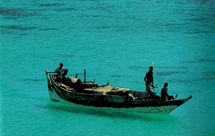 Circumnavigata l’isola, ci concediamo un bagno ristoratore in un’ acqua turchina e calda e un po’ di pesca alla traina, tanto da procurare il pesce per la cena, cosa per nulla difficile, dato che in breve mettiamo a pagliolo un barracuda, un dentice e un paio di carangidi. Intanto arriva anche il sambuco e, delegate le incombenze culinarie a Marco e Roberto, ci possiamo dedicare alla preparazione del primo campo… a bordo. La nostra intenzione è infatti di dormire e, quando occorre, cucinare sul gommone, decisione quanto mai opportuna, come avremmo scoperto in seguito, perché Difnein è stata minata e mettere piede a terra non sarebbe per nulla salutare! Disponiamo di una tenda da campeggio appositamente realizzata per il nostro gommone, che