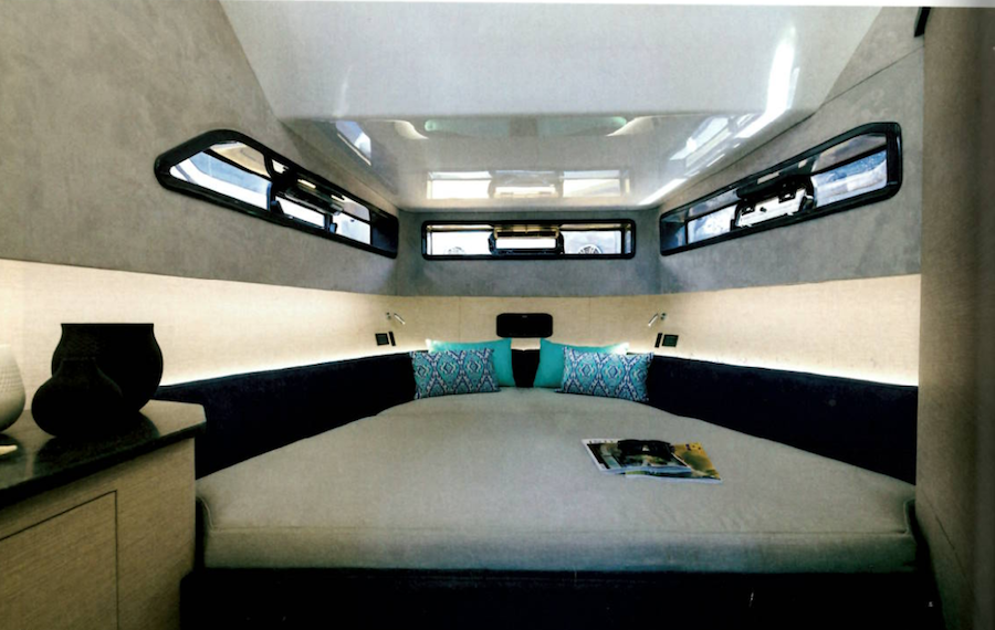 Questo è ben protetto dal sole dal Top in carbonio ed è attrezzato con un doppio tavolino e il divano che fronteggia la cucina, collocata nella classica posizione alle spalle della tripla postazione di guida. Mi è piaciuta in modo particolare la zona di prua dove la scelta di avere l’ancora a scomparsa (esce dal dritto di prua) libera una grande superficie vivibile con un prendisole/divano orientato fronte marcia e un secondo divanetto che invece guarda verso poppa (da sottolineare i solidi tientibene ben posizionati anche in quest’area). Arriviamo ora agli interni, dove lo spazio regina è sicuramente la grande cabina di prua che gode di buone altezze e molta luminosità. Il bagno è decisamente voluminoso, con il box doccia separato. La seconda cabina è separata da un portello scorrevole ed è a poppa sotto il pozzetto. Vista la collocazione è necessariamente meno spaziosa (soprattutto in termini di altezza) di quella di prua, ma comunque abitabile e perfetta per i più giovani membri dell’equipaggio.