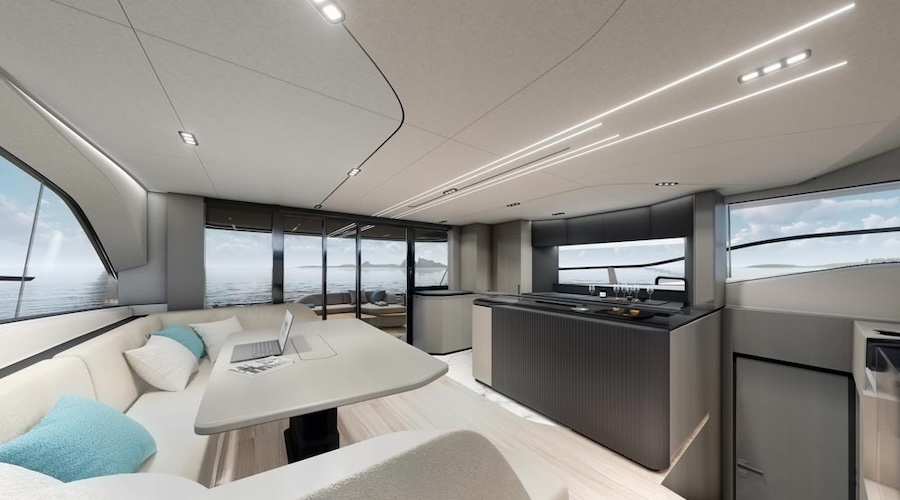 Stylistically, the design, starting with the profile, which is closer to that of a monohull yacht than to multihulls as we usually understand them, immediately jumps out at us. The bow of theApycat 56 is high on the water, vertical, the central body is slender, projected toward the stern, and the freeboard is descending, drawing a step that rises running toward the bow, cut by a long window that occupies the entire broadside, a profile signed Pininfarina and De Simoni Yacht Design. But the Apycat 56 is a catamaran, and the volumes and layouts fully emphasize this. In fact, even looking at the deck shows the attention paid to livability, movement spaces and overall comfort.