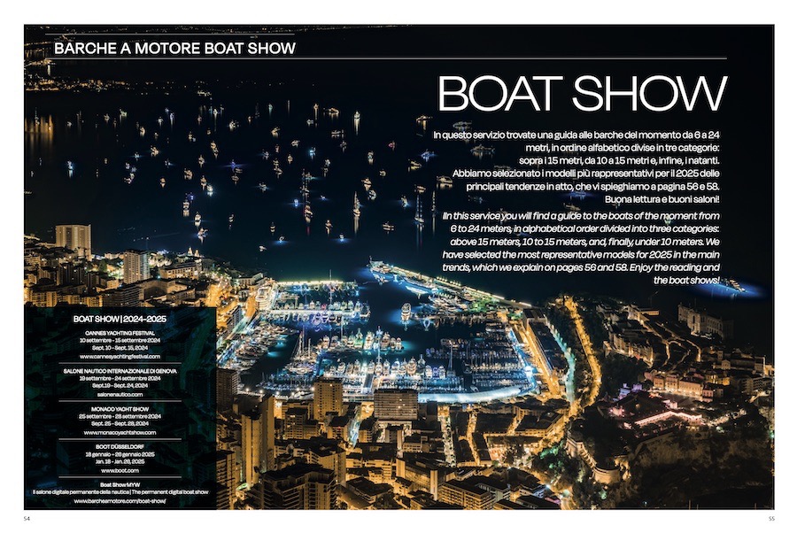 In questo servizio trovate una guida alle barche del momento da 6 a 24 metri, in ordine alfabetico divise in tre categorie: sopra i 15 metri, da 10 a 15 metri e, infine, i natanti. Abbiamo selezionato i modelli più rappresentativi per il 2025 delle principali tendenze in atto, che vi spieghiamo a pagina 56 e 58. Buona lettura e buoni saloni. Da pagina 54
