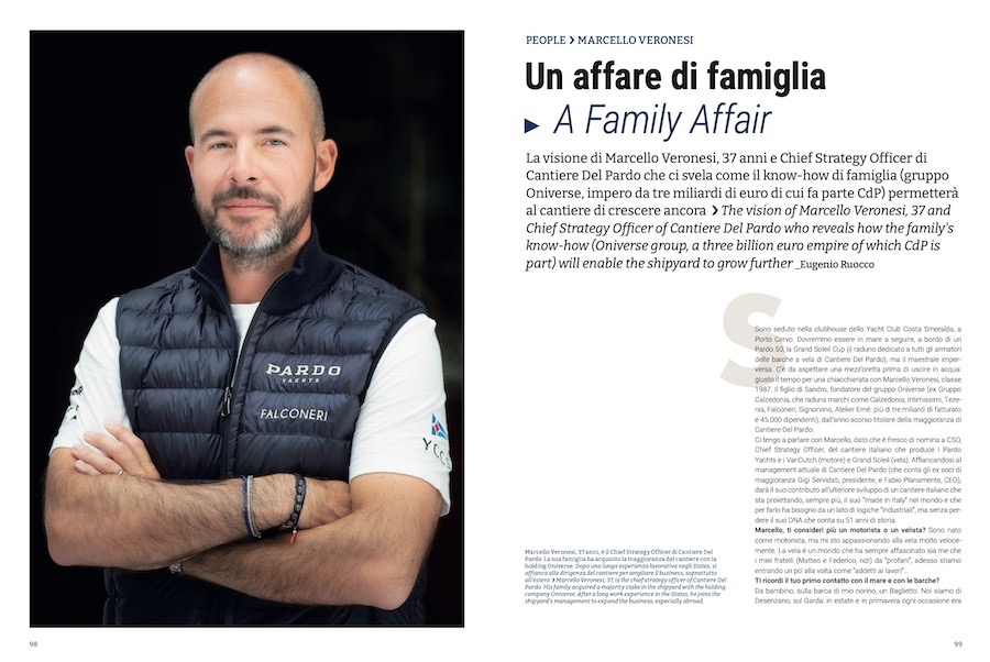 La visione di Marcello Veronesi, 37 anni e Chief Strategy Officer di Cantiere Del Pardo che ci svela come il know-how di famiglia (gruppo Oniverse, impero da tre miliardi di euro di cui fa parte CdP) permetterà al cantiere di crescere ancora. Da pagina 98