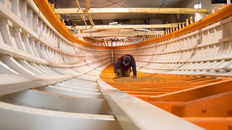 The bow housed the crew quarters, with bunks, services and galley, while, amidships, engine room, towing components and pilot house.
