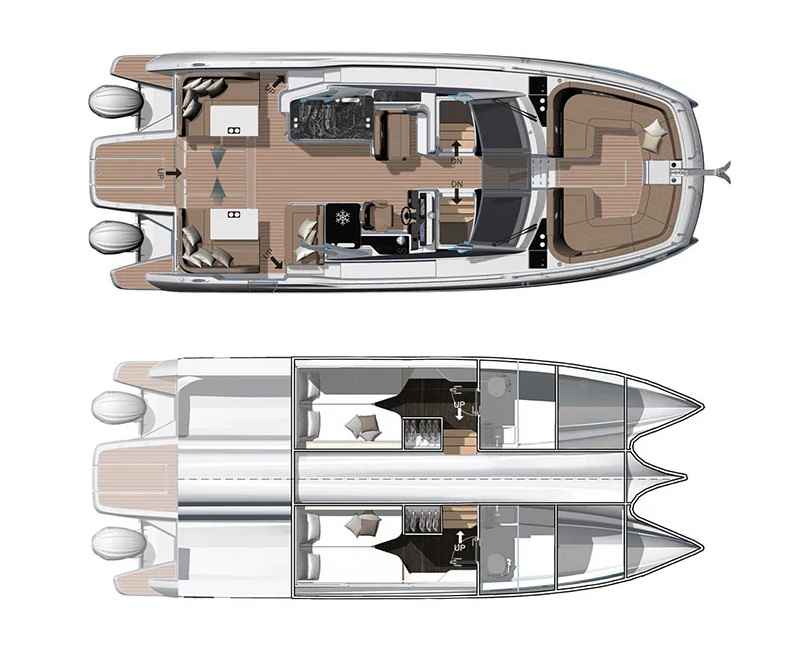 Now, below deck, there is room for no less than two cabins, twins, each with a private bathroom with separate shower, one per hull. A great configuration even with a view to chartering or sharing for two couples. In the cockpit, the living area is really large for the size: the yard claims 15 m² of usable area in this area alone. The galley is central, equipped with a sink, 65 L refrigerator and optional grill, and there are sliding benches that transform the living room into a sundeck. To shelter this area even more, a full-height windshield can be chosen instead of the classic low windshield, which is sportier but less protective.