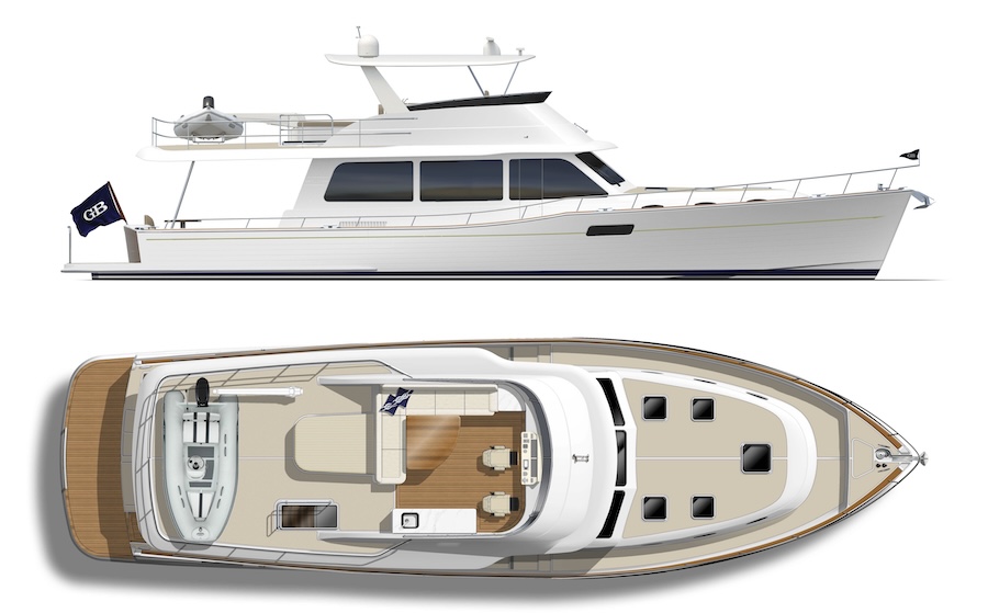 Che sia in versione Flybridge o Skylounge (un fly, chiuso), il nuovo GB62 mantiene quindi il classico slancio prodiero, così come la tuga prodiera rialzata, fruibile come prendisole, e le “pannellature” a murata. A poppa, invece, coperto dal fly sovrastante, il pozzetto si presenta spazioso, arredato con un classico divano servito da tavolino. A poppa, gli spazi affacciano su una plancetta da bagno generosa mentre, il tender, trova invece posto all’estremità del fly, senza variare tra le due versioni.