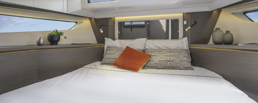 In the bow, the master stateroom, equipped with a double bed and developed over the entire available beam.