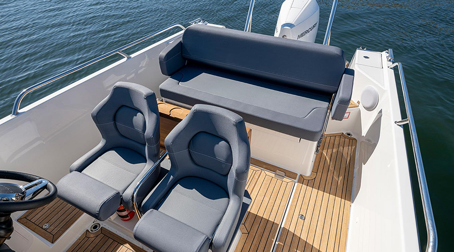 La plancia è dotata di tre distinte opzioni plotter, nello specifico da 7, 9, o un 12 pollici. Le sedute di guida sono invece ruotabili, soluzione che consente la creazione di una vera e propria dining area poppiera per 5 persone. Ovviamente, il tavolino è retrattile in modo da non ingombrare in in pozzetto. Il tutto, opzionalmente, protetto da tre configurazioni T-Top: harbour cover, helm canopy e T-Top large, a coprire l’intera parte poppiera. Soluzioni flessibili e ottimali per mantenere la sensazione di open-air, riparandosi però dagli elementi più fastidiosi.