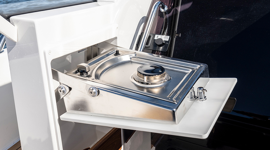 Il divano poppiero è poi forse la chicca in termini di arredo. In grado di accomodare 6 persone nella sua variante normale (3 per lato), il divano è in realtà dotato di uno schienale configurabile in tre diverse posizioni, in base alle necessità. Sono così possibili una seduta standard (90°), lounge (45°), o prendisole puro (ripiegato). Infine, sempre sotto il divano poppiero, si trovano un gavone refrigeratore e vari gavoni. A poppavia una doccia, e gavoni ulteriori.