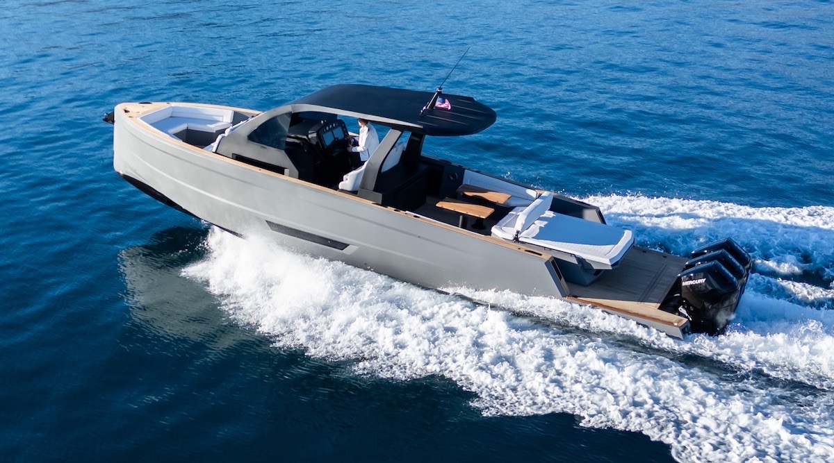 Ma non fatevi ingannare dall’aspetto: questa barca non è fatta solo per la crociera in famiglia, ma anche per correre… e per correre forte. Una carena a doppio step spinta da 3 motori fuoribordo da 450 cv l’uno, per un totale di 1350 cv, che può raggiungere i 51 nodi di velocità massima.