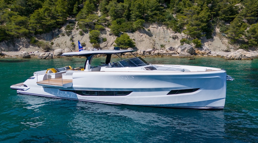 Thanks to the line, this hull offers significant bow spaces and protected passages, deflecting splashes and keeping the deck dry. Navigational quality is, in fact, a central theme for the yard. Folding bulwarks in the cockpit, on the other hand, expand the surface area, thus offering a true aft terrace on the sea, slender at the stern and protected, amidships, by an open hard top.