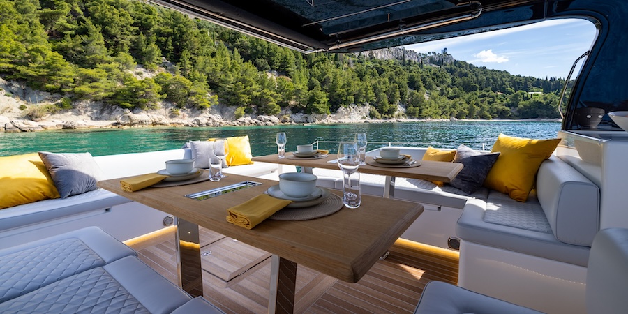 High freeboard, folding broadside, plenty of lounge areas and classy looks. Aesthetics aside, however, the interior layout is also noteworthy and suitable for longer sailings.