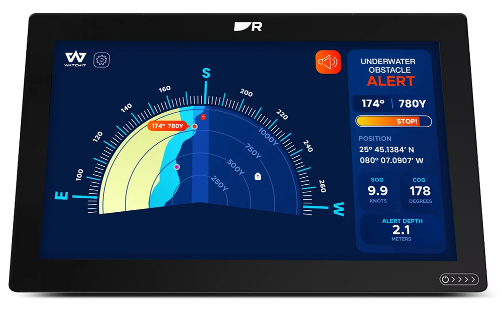 Once installed, the system functions as an ever-alert “watchman” working to identify potential hazards in the radius around the vessel. If there is an alert to be reported, the Smart Prevention System signals the information with a pop-up on the display and also alerts aurally through a proprietary speaker, first by speaking a phrase (e.g., “Danger, starboard obstruction”) and then through a siren-like sound. Watchit can recognize only real “threats” to the vessel and will not continually disturb the occupants with unnecessary alerts-it will only activate when necessary.
